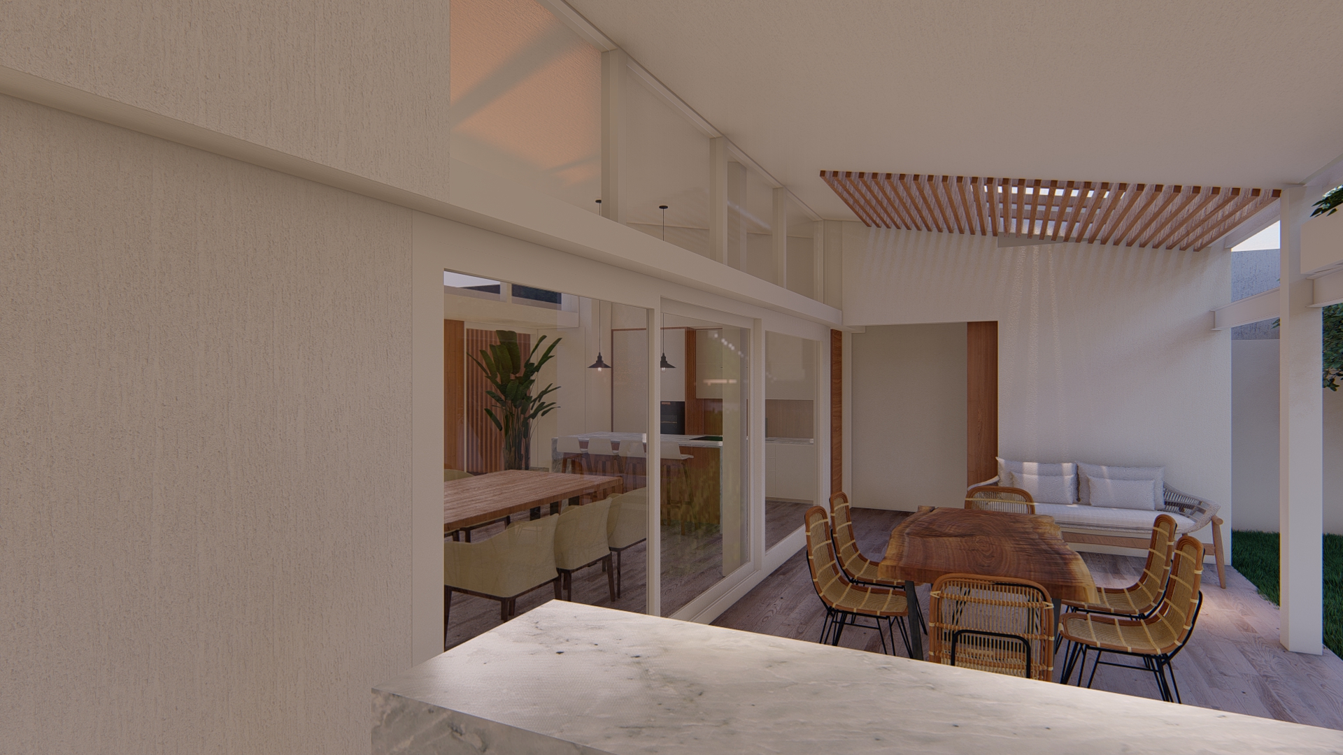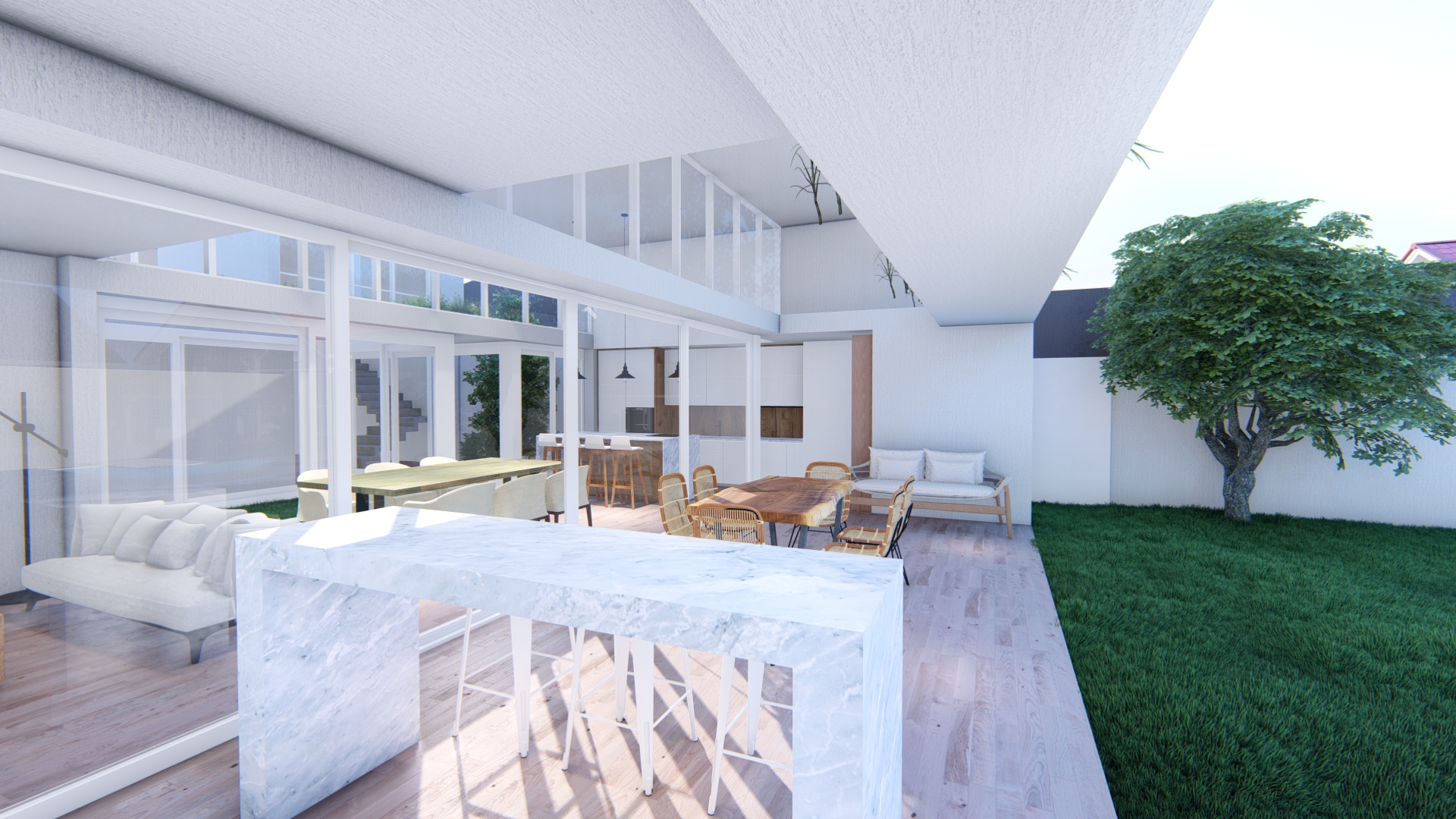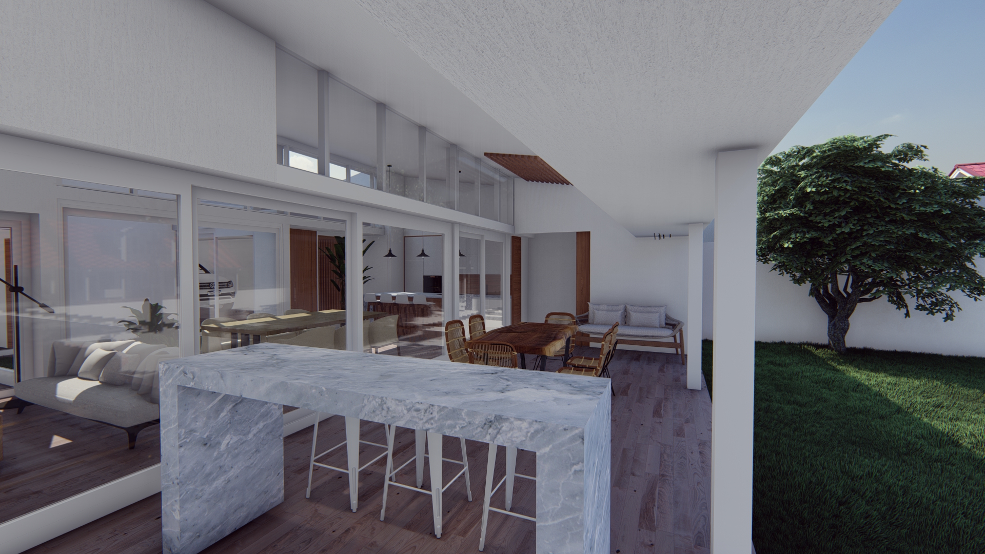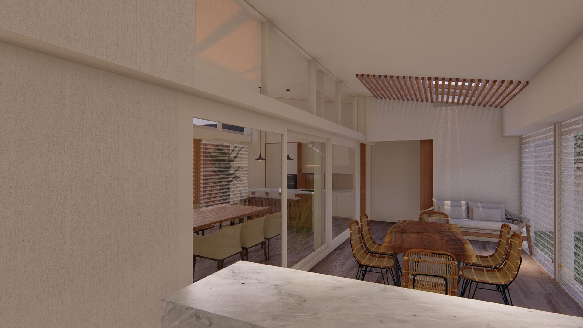 Se establece una continuidad espacial entre estar y galería, configurando una expansión semicubierta que amplía el uso del espacio social.