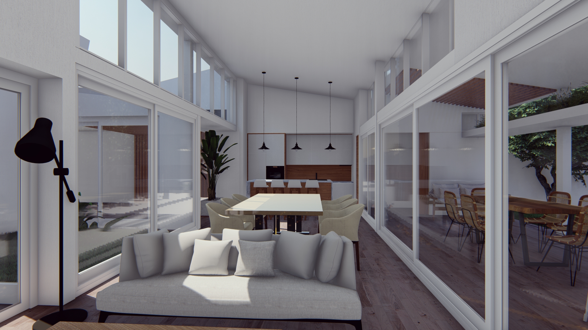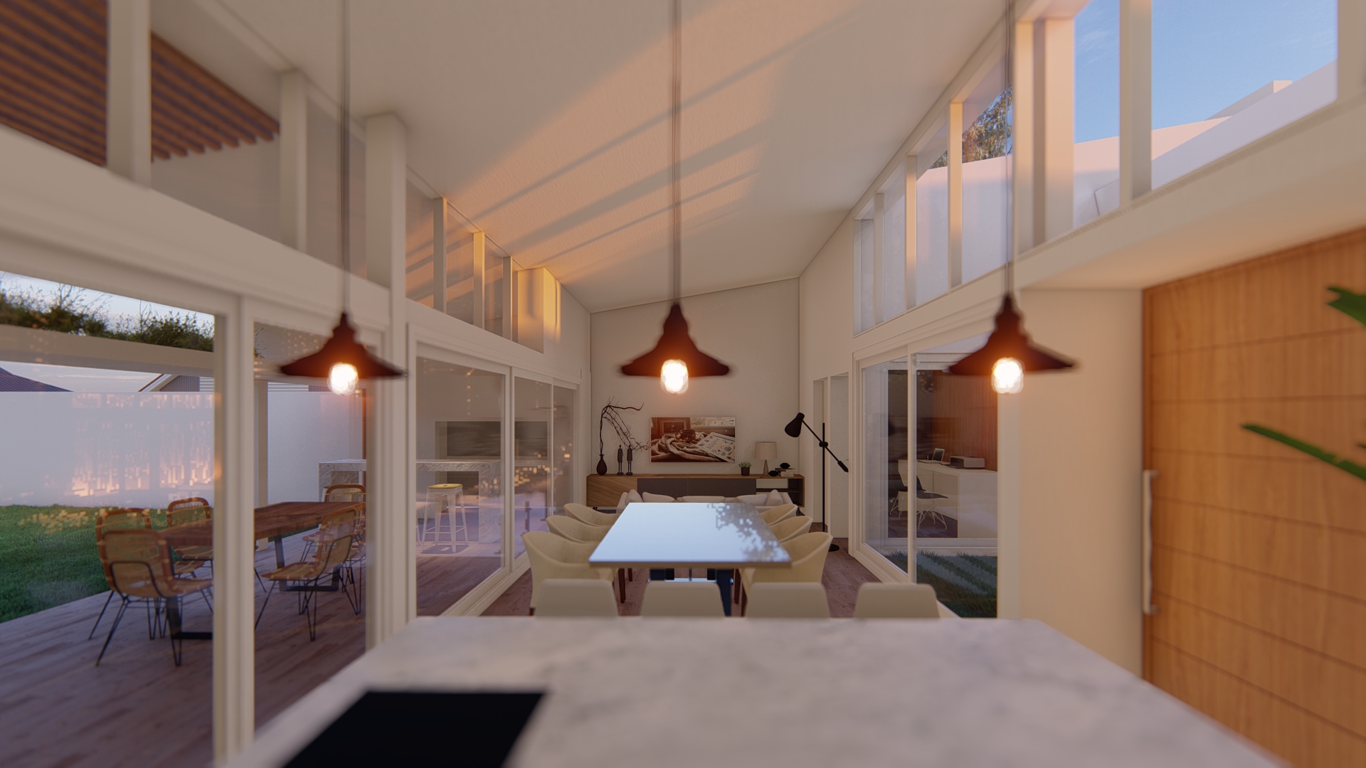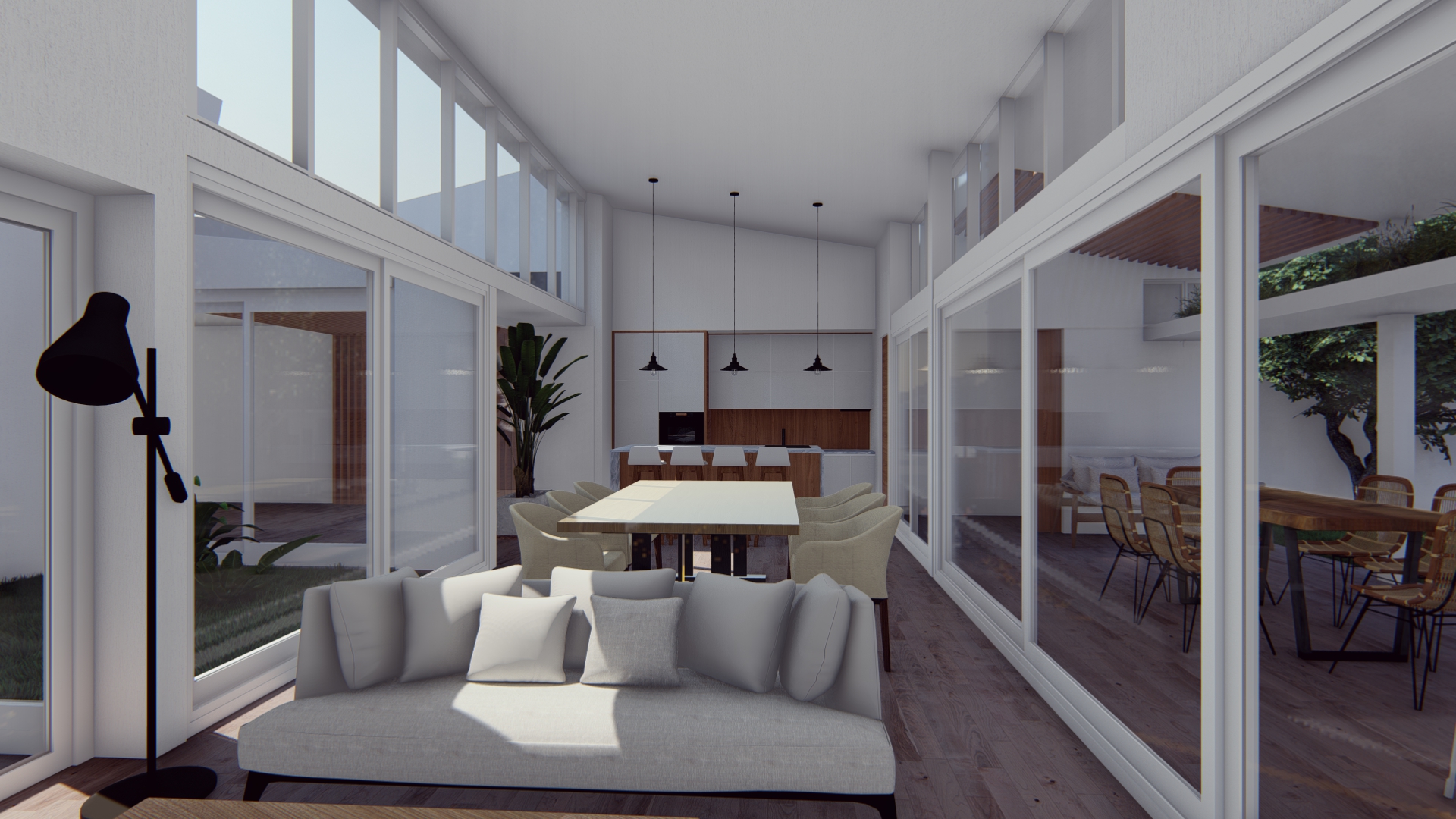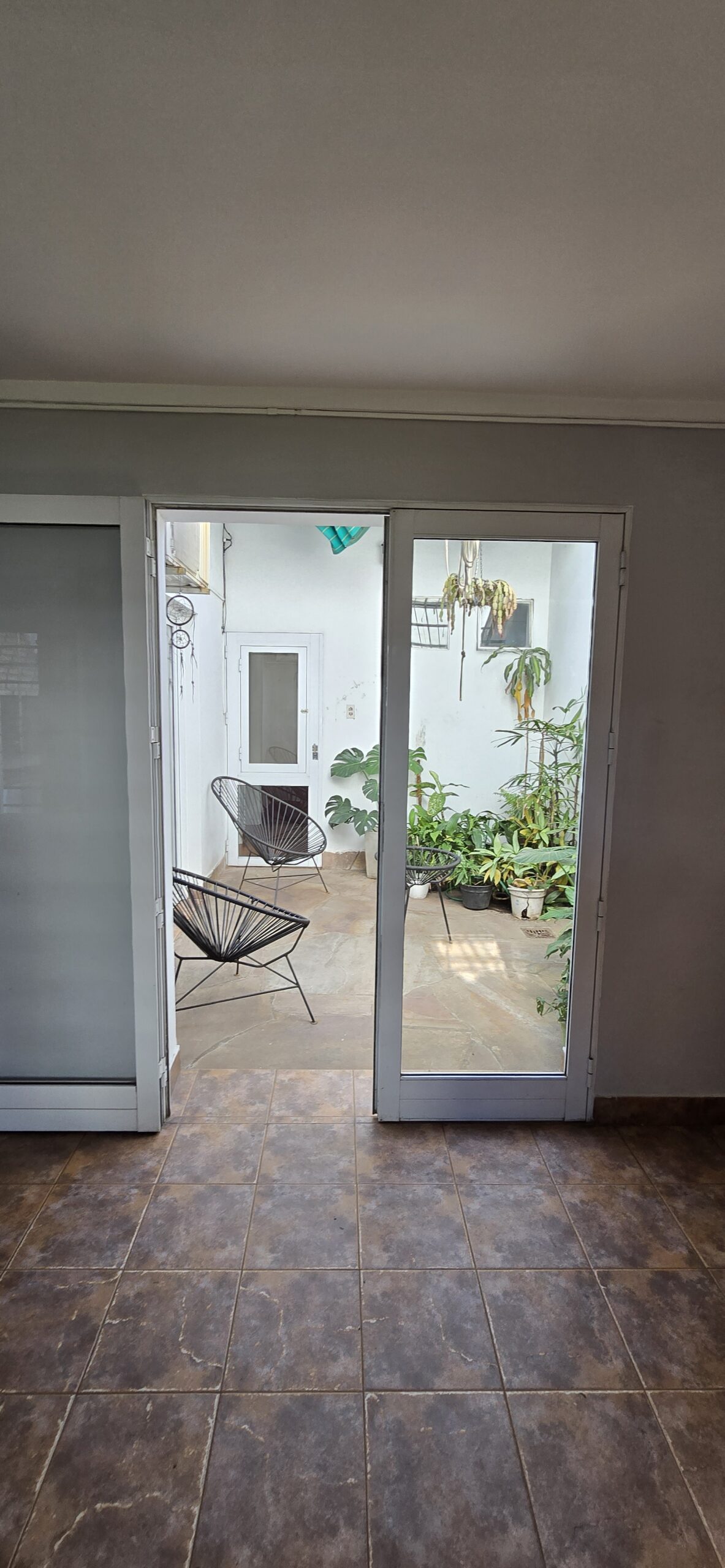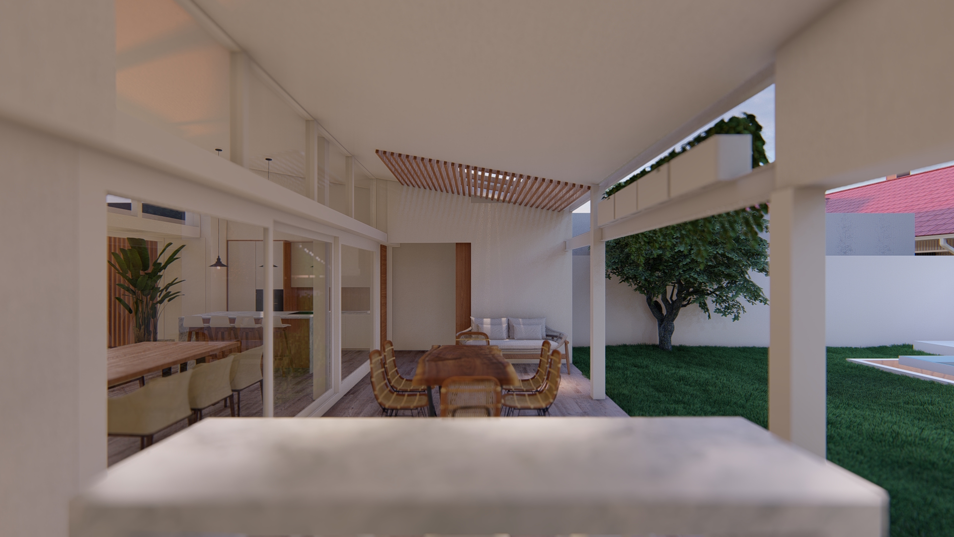 Se establece una continuidad espacial entre estar y galería, configurando una expansión semicubierta que amplía el uso del espacio social.