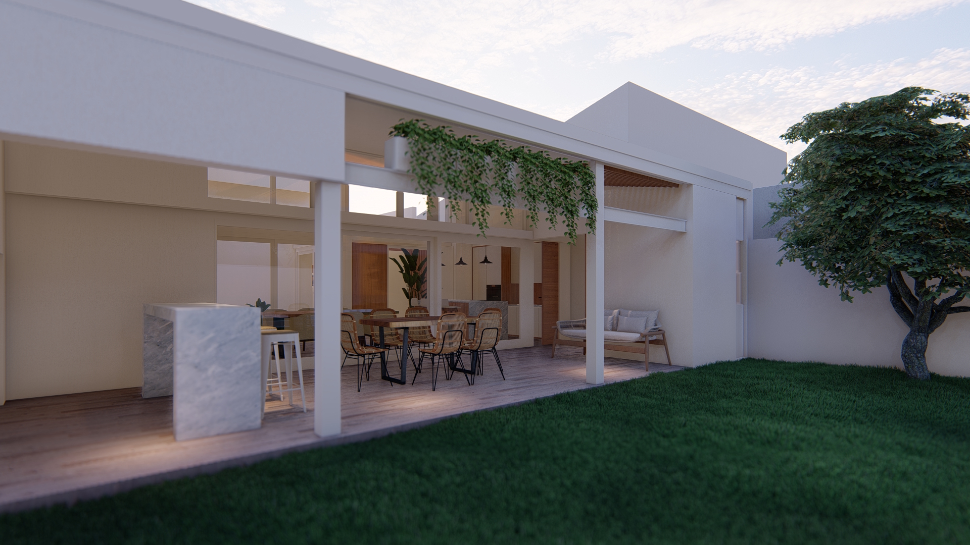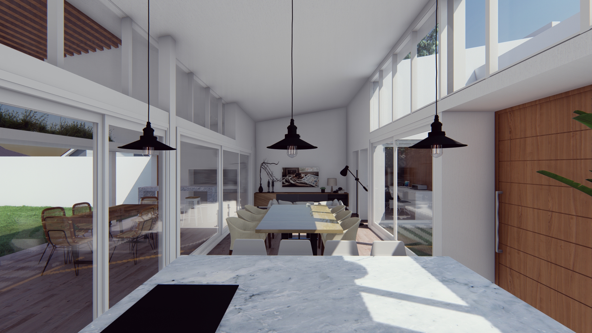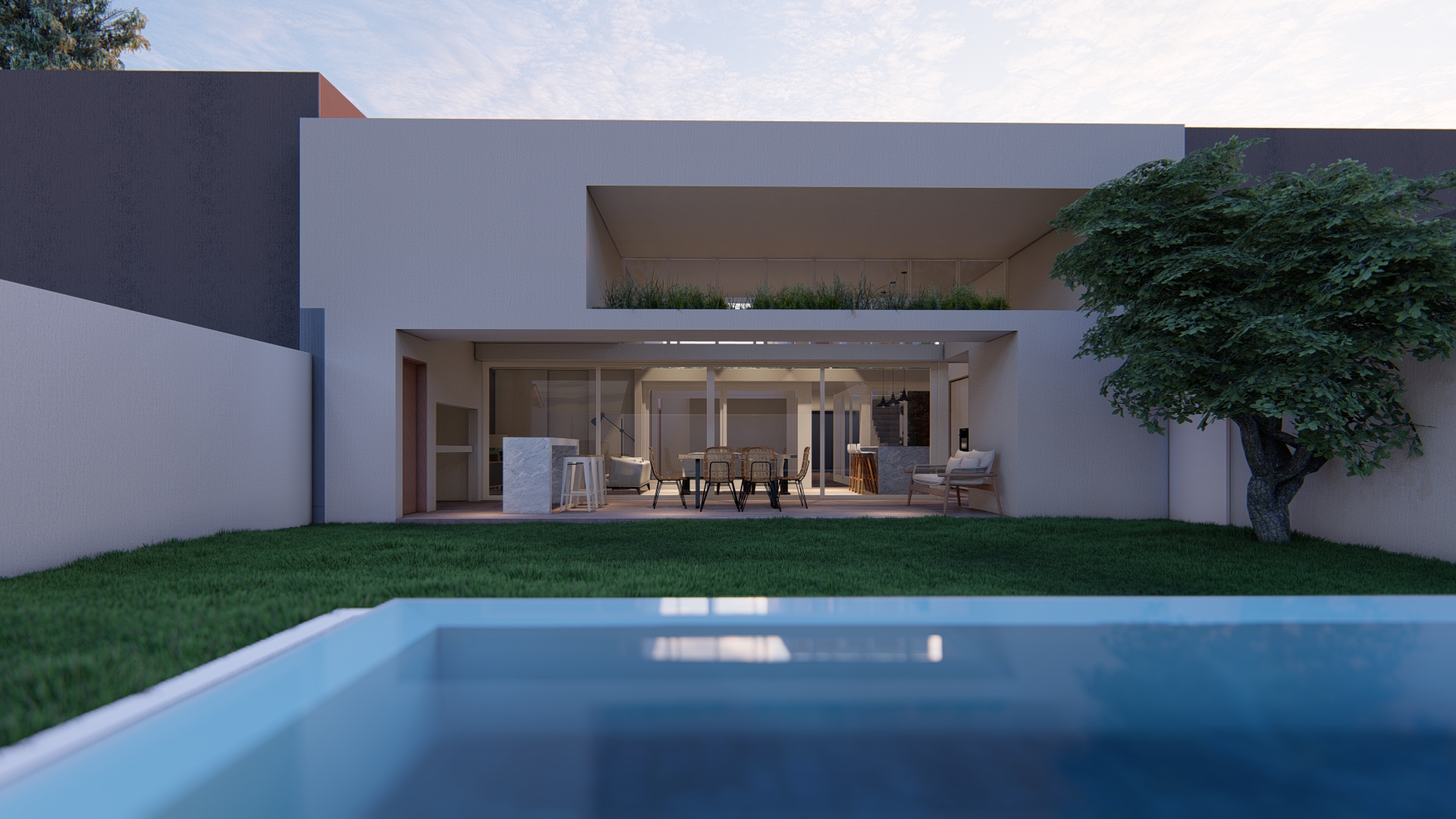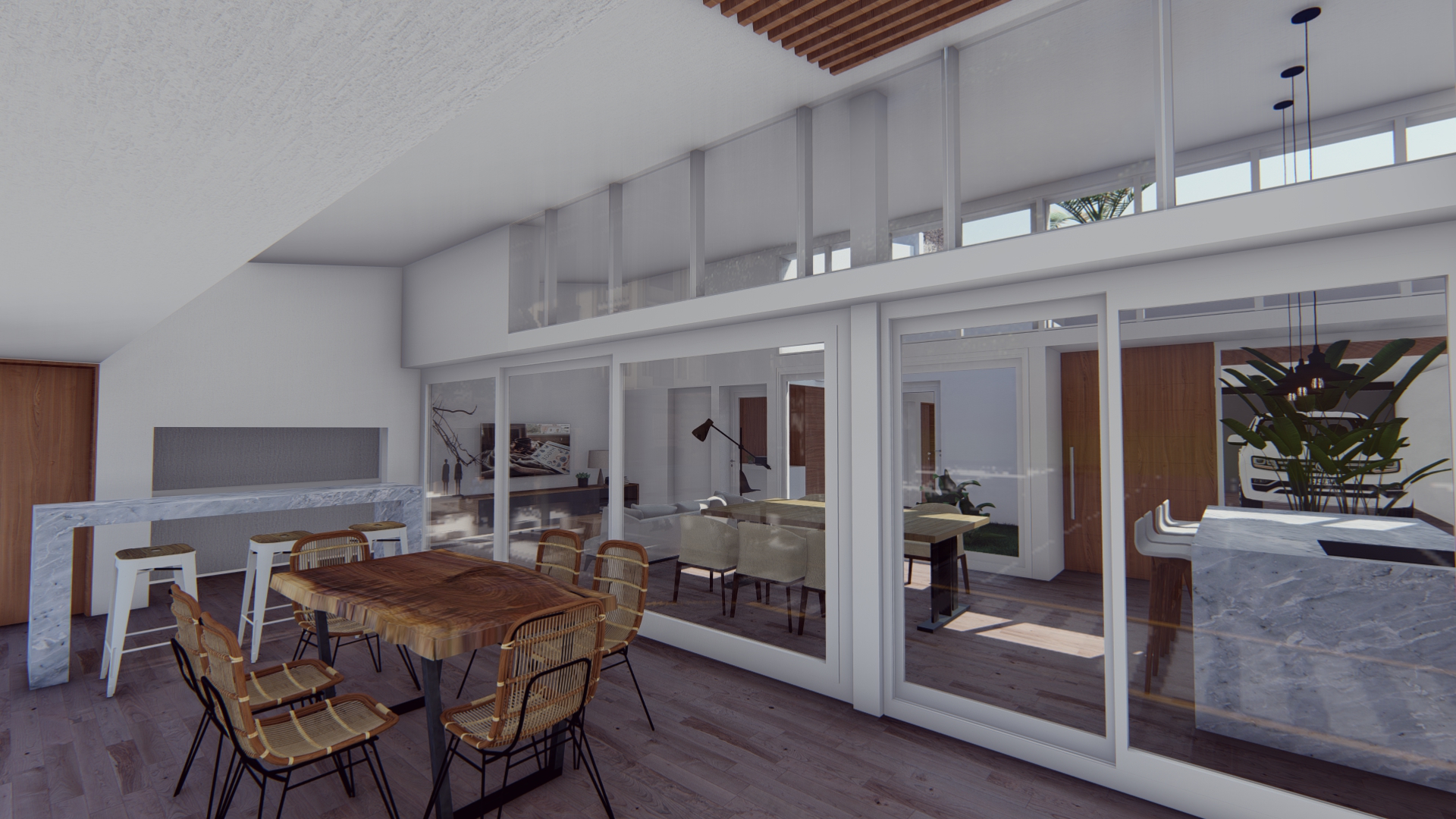 Se establece una continuidad espacial entre estar y galería, configurando una expansión semicubierta que amplía el uso del espacio social.