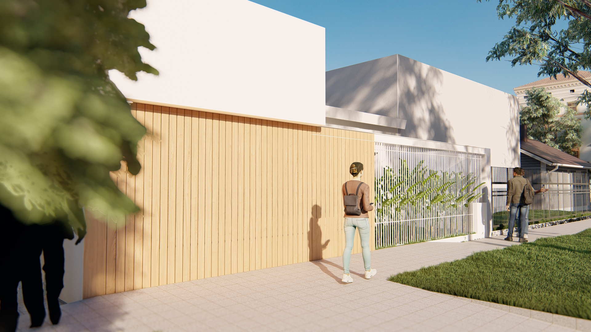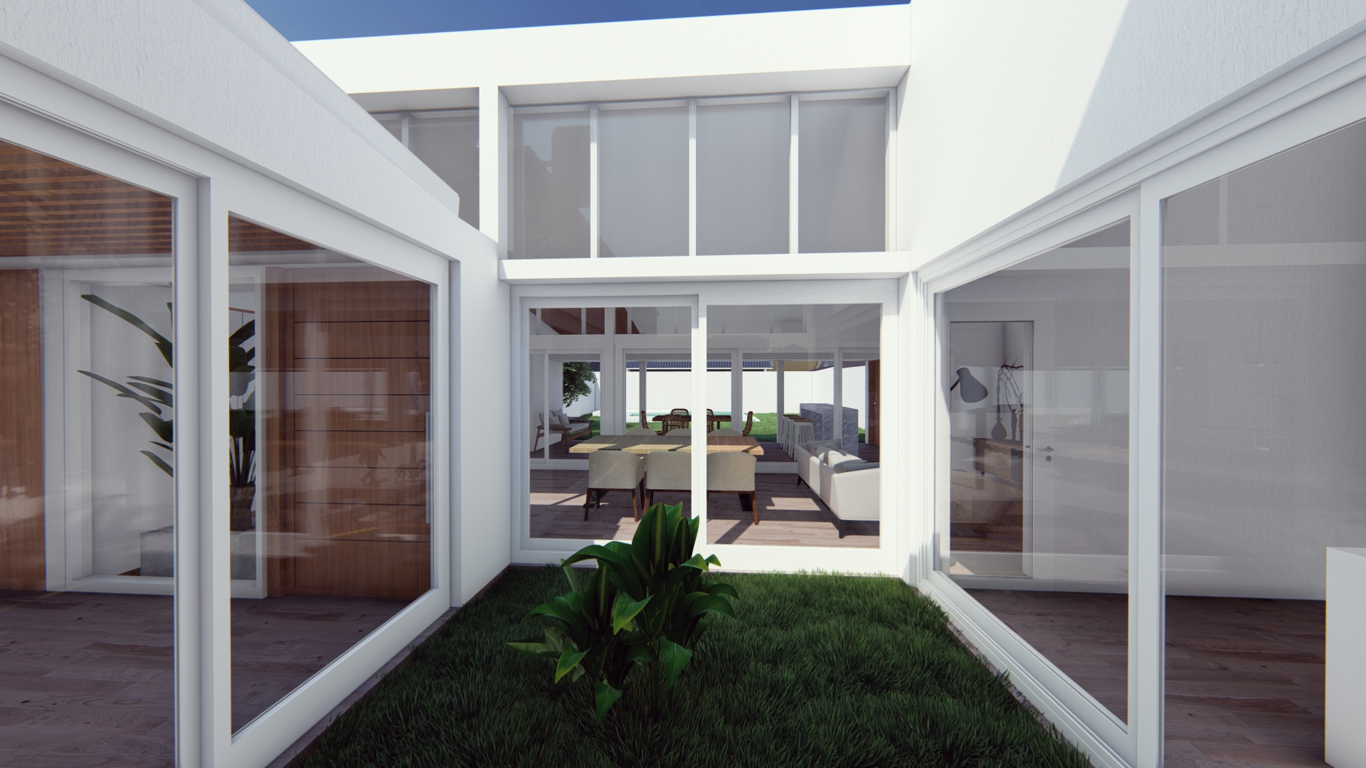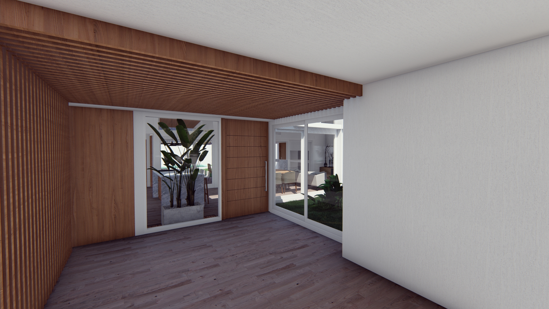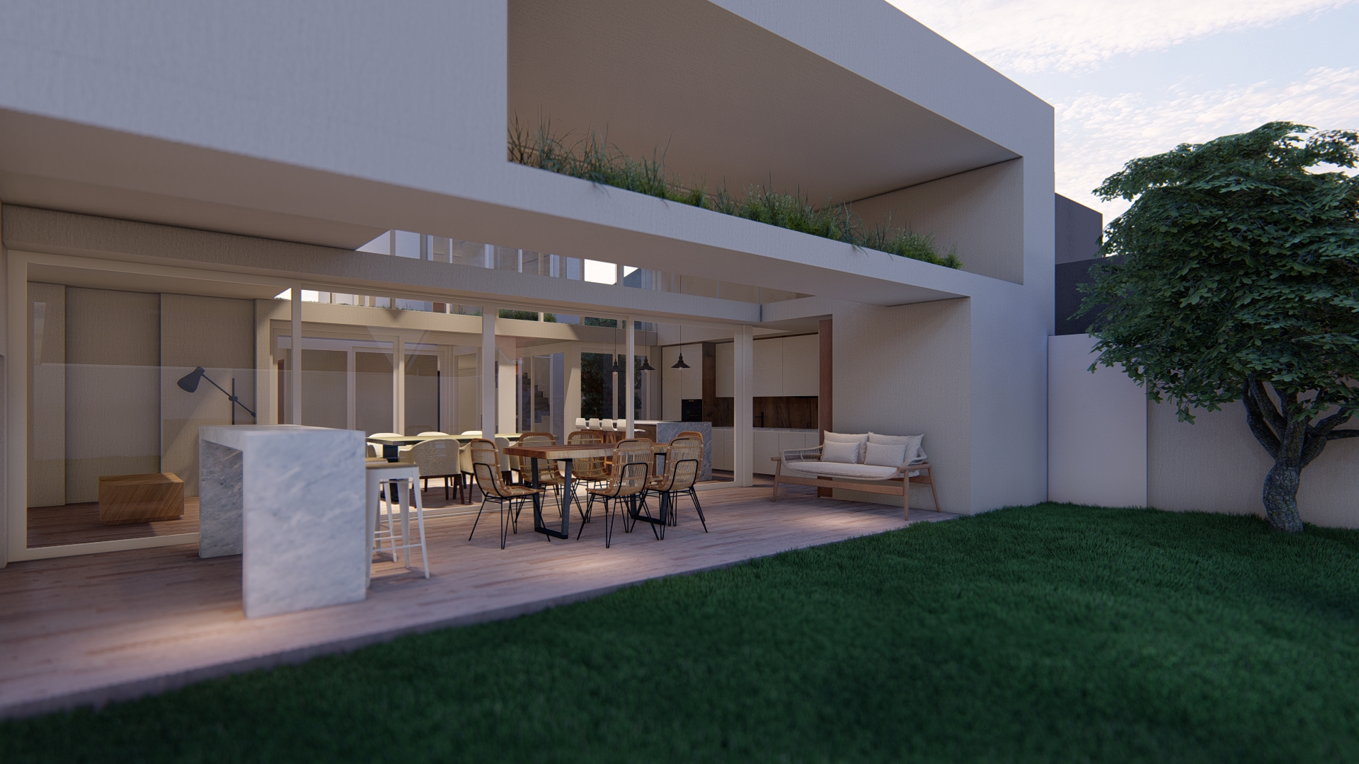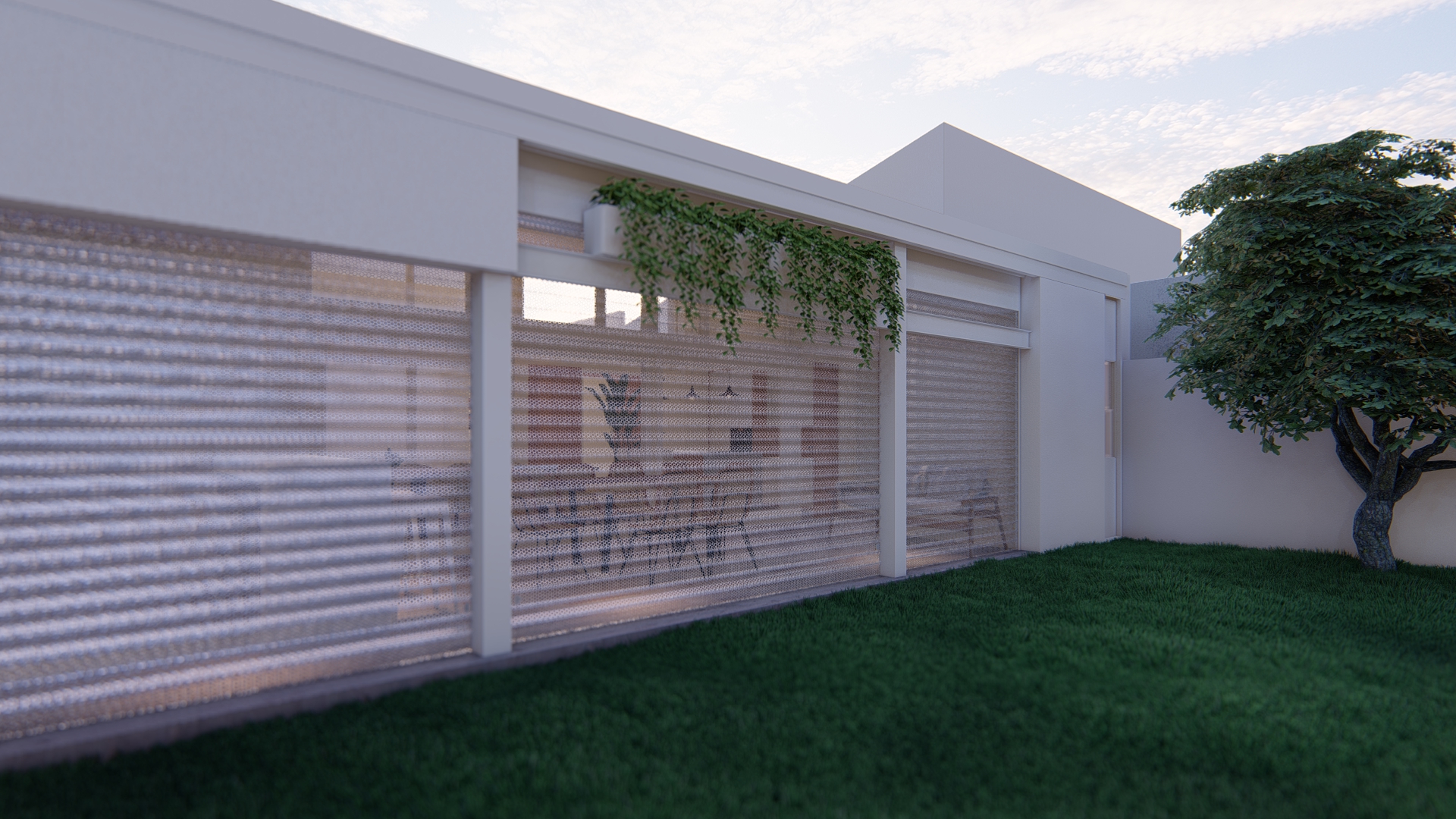 Se establece una continuidad espacial entre estar y galería, configurando una expansión semicubierta que amplía el uso del espacio social.