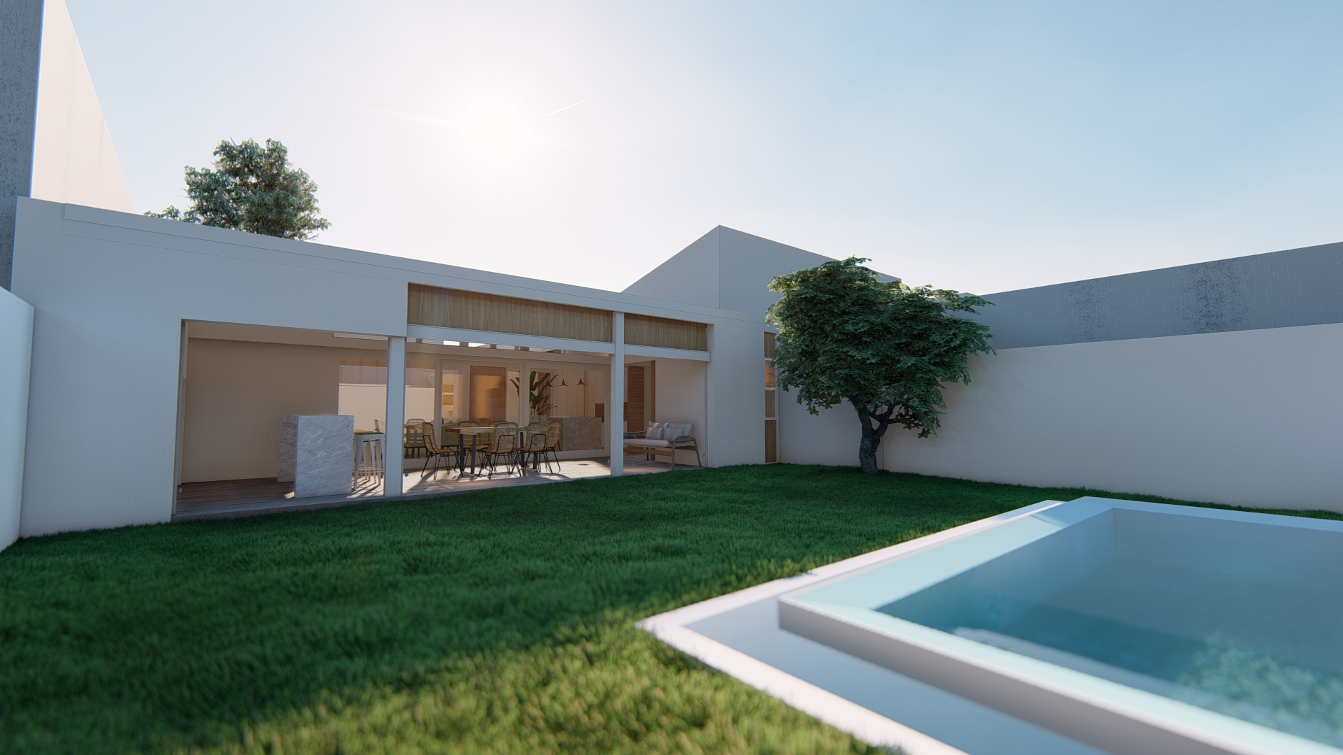 El área de intervención se concentra en el sector social, donde se redefine el conjunto cocina–comedor–lavadero, consolidándolo como núcleo funcional de la vivienda. Se refuerza su relación con el patio, favoreciendo el asoleamiento y la ventilación cruzada.