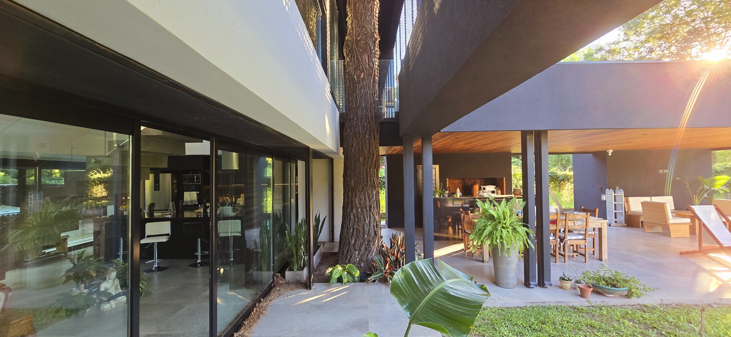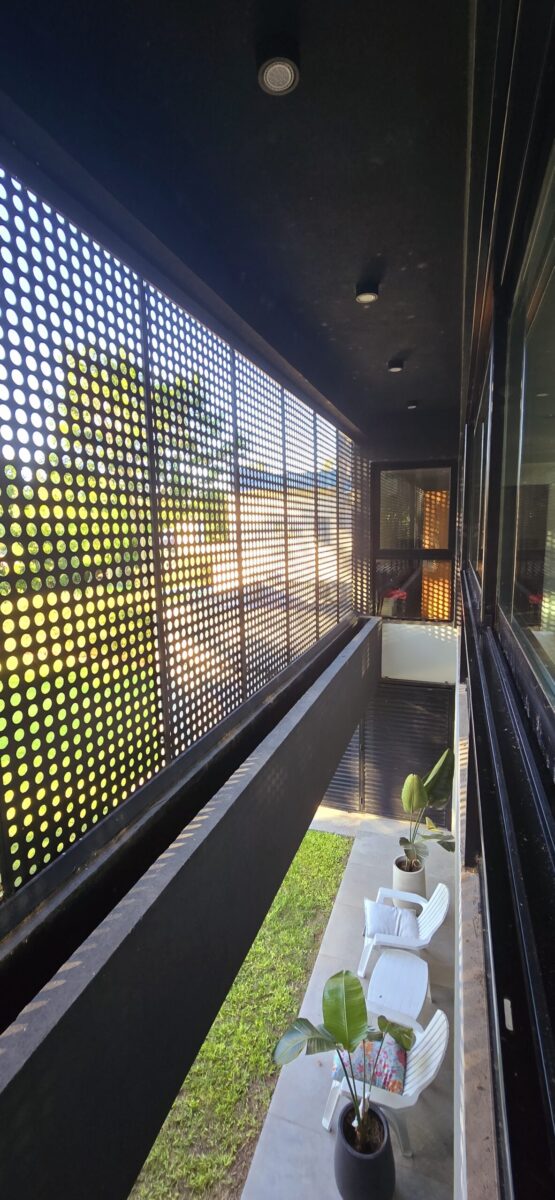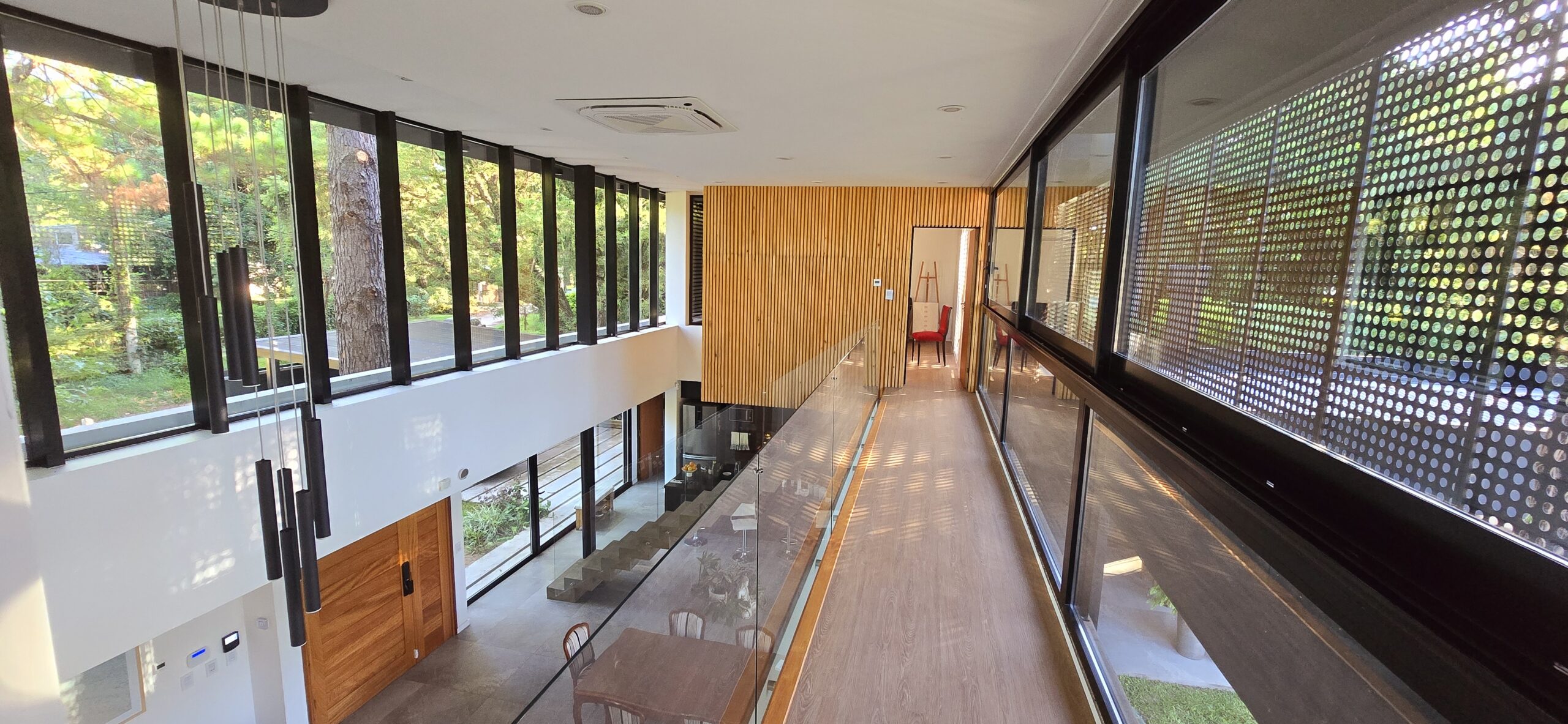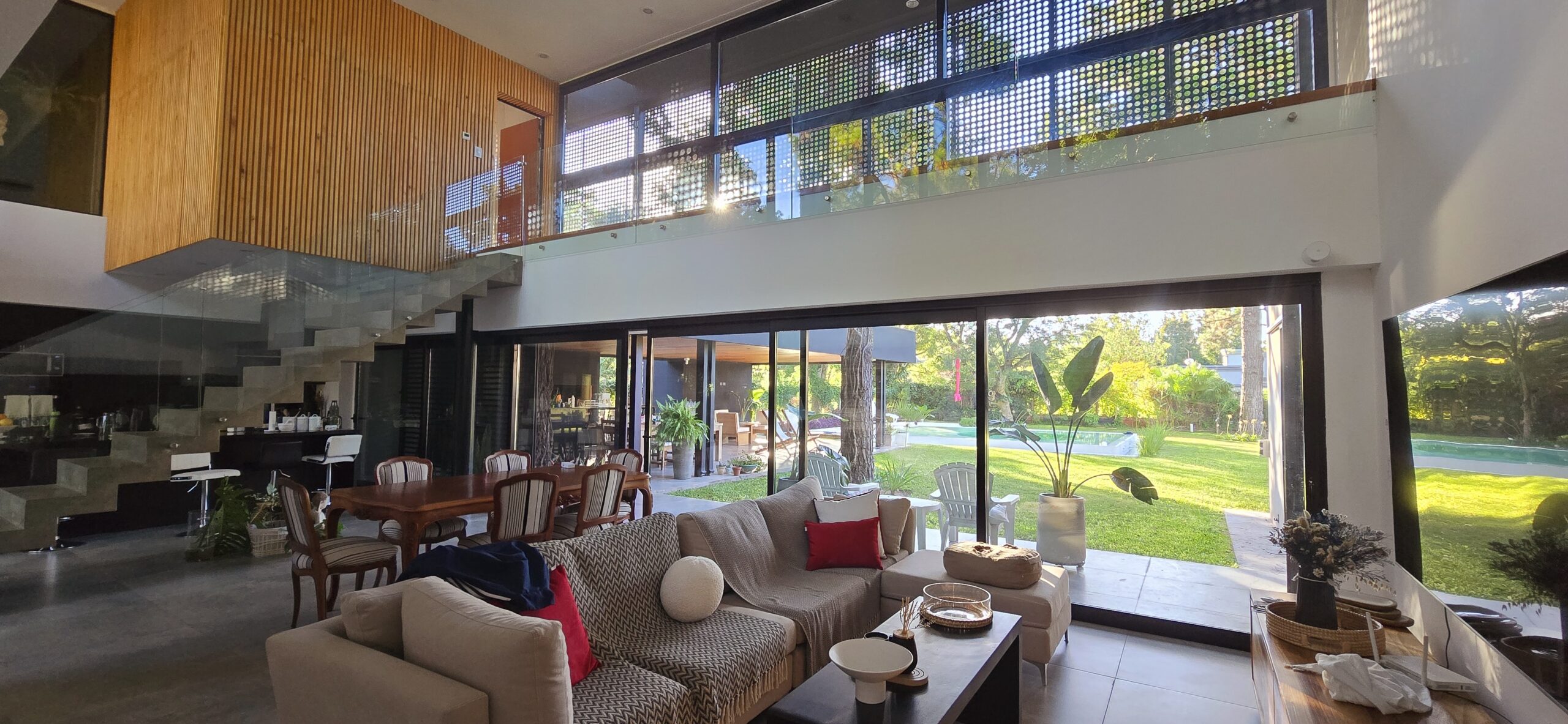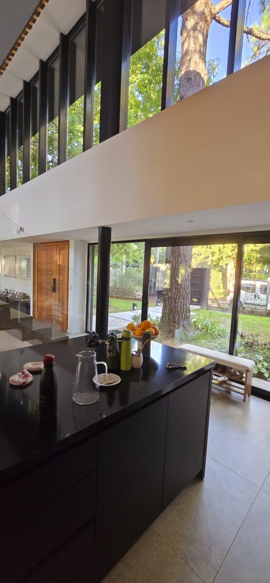 La galería con su pantalla verde, trabaja en este sentido y genera la transición de un espacio abierto a uno cerrado. Es un apoyo al quincho y al estar principal. Este espacio intermedio con doble altura, también protege a la vivienda, actuando de para sol en verano, tamizando los rayos solares, pero permitiendo que la planta alta que posee toda su fachada acristalada tenga optimas visuales y obtenga también la sensación de estar en un lugar natural y alejado de la ciudad.