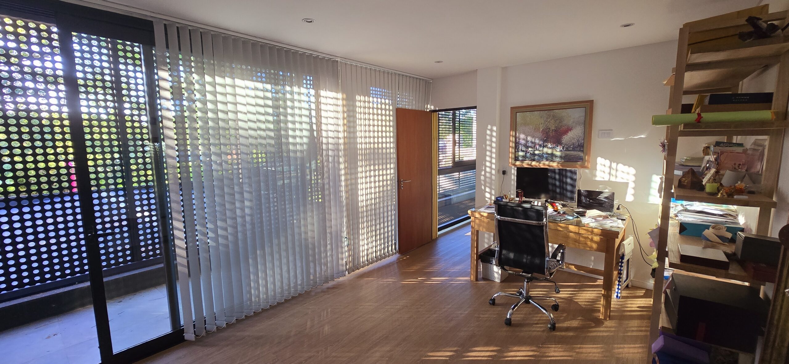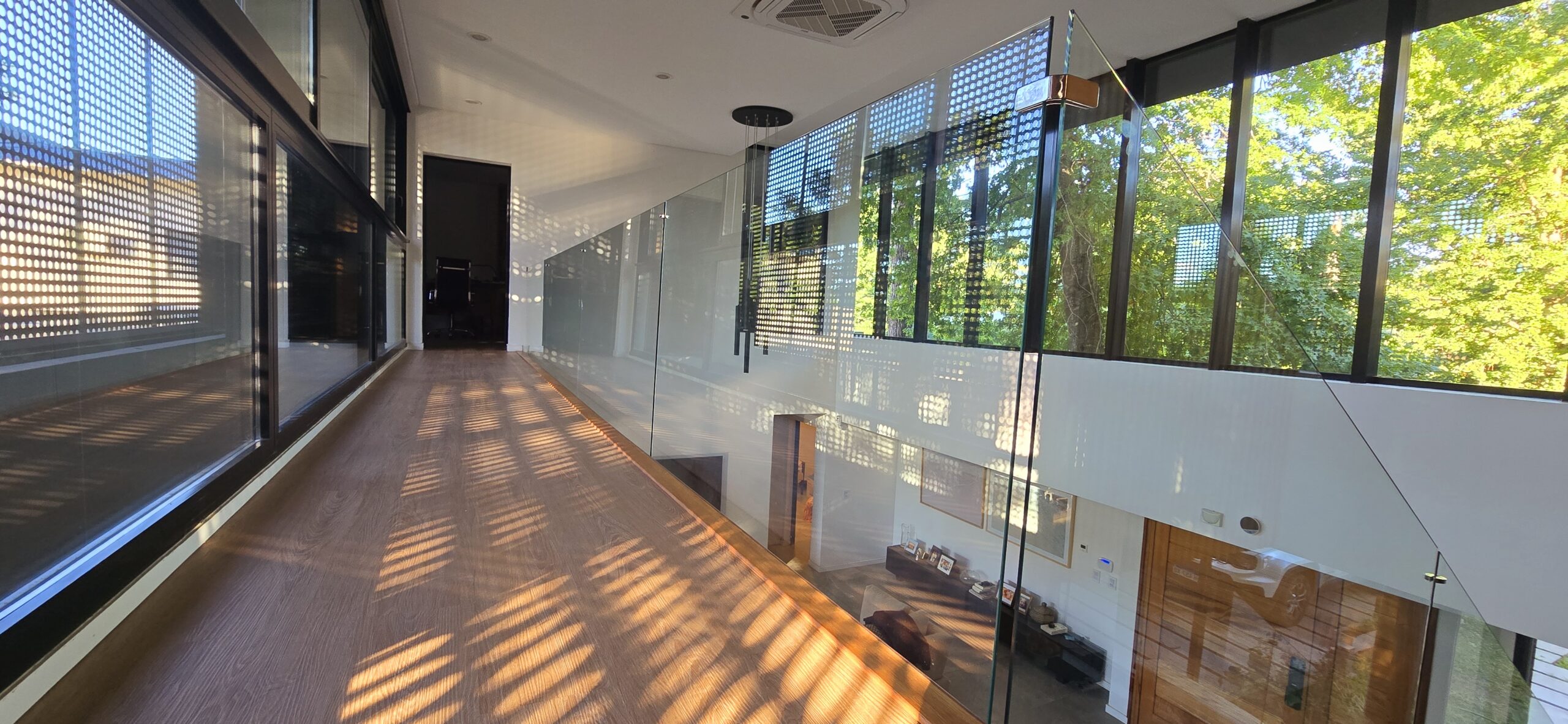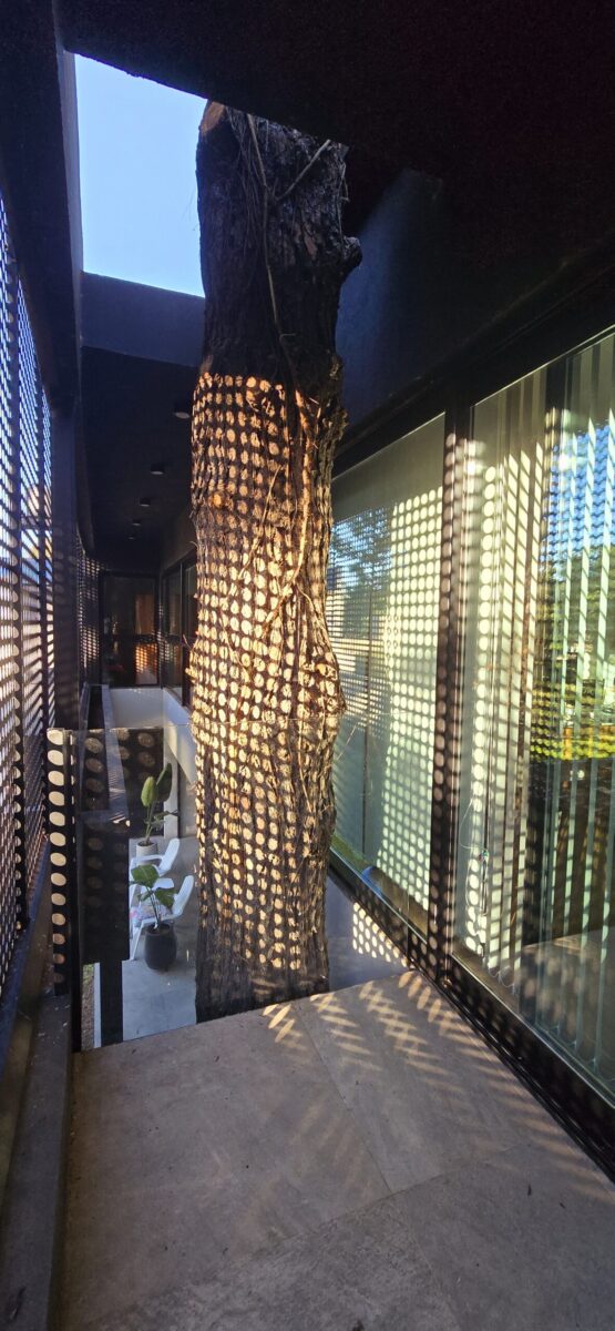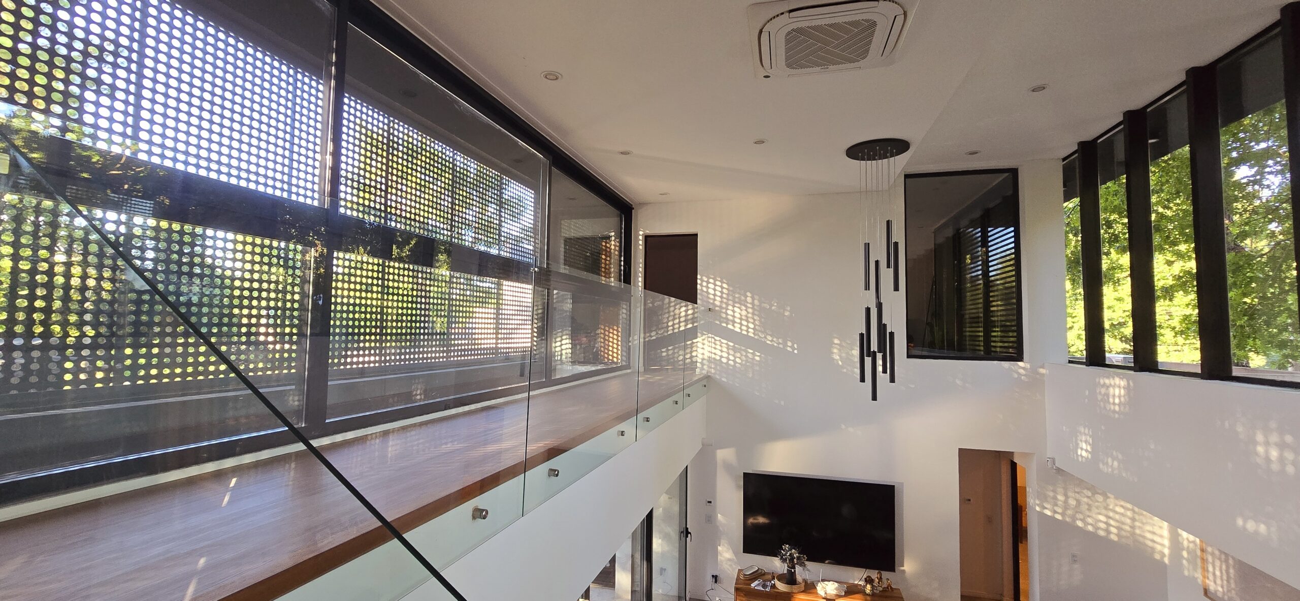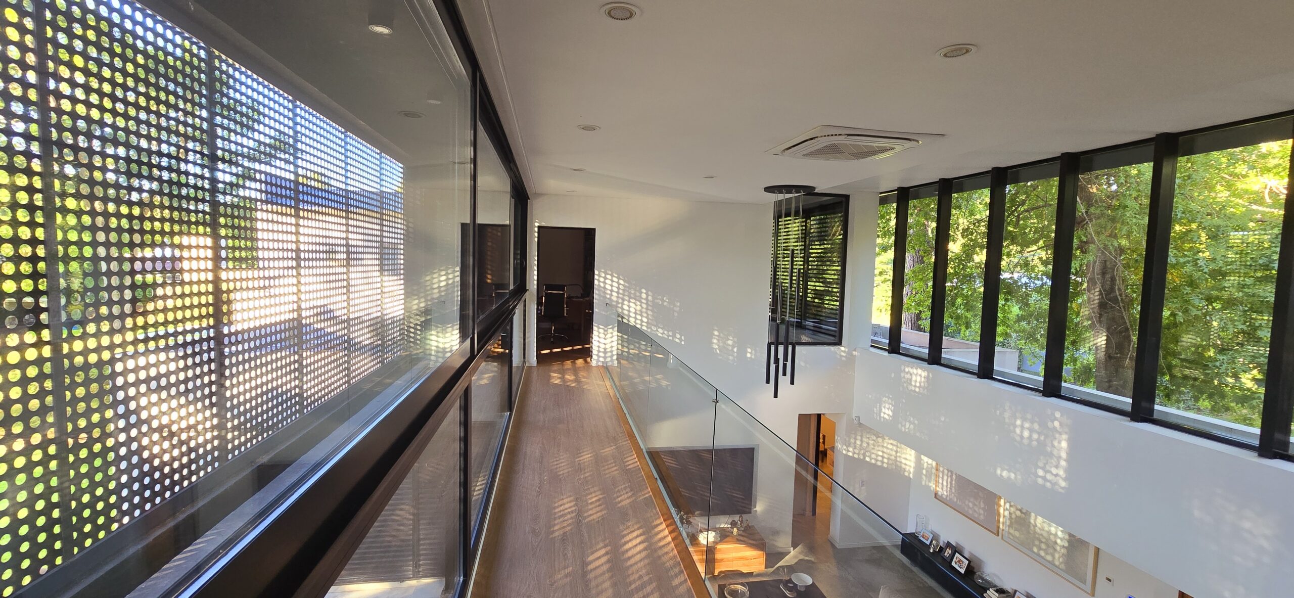 La galería con su pantalla verde, trabaja en este sentido y genera la transición de un espacio abierto a uno cerrado. Es un apoyo al quincho y al estar principal. Este espacio intermedio con doble altura, también protege a la vivienda, actuando de para sol en verano, tamizando los rayos solares, pero permitiendo que la planta alta que posee toda su fachada acristalada tenga optimas visuales y obtenga también la sensación de estar en un lugar natural y alejado de la ciudad.