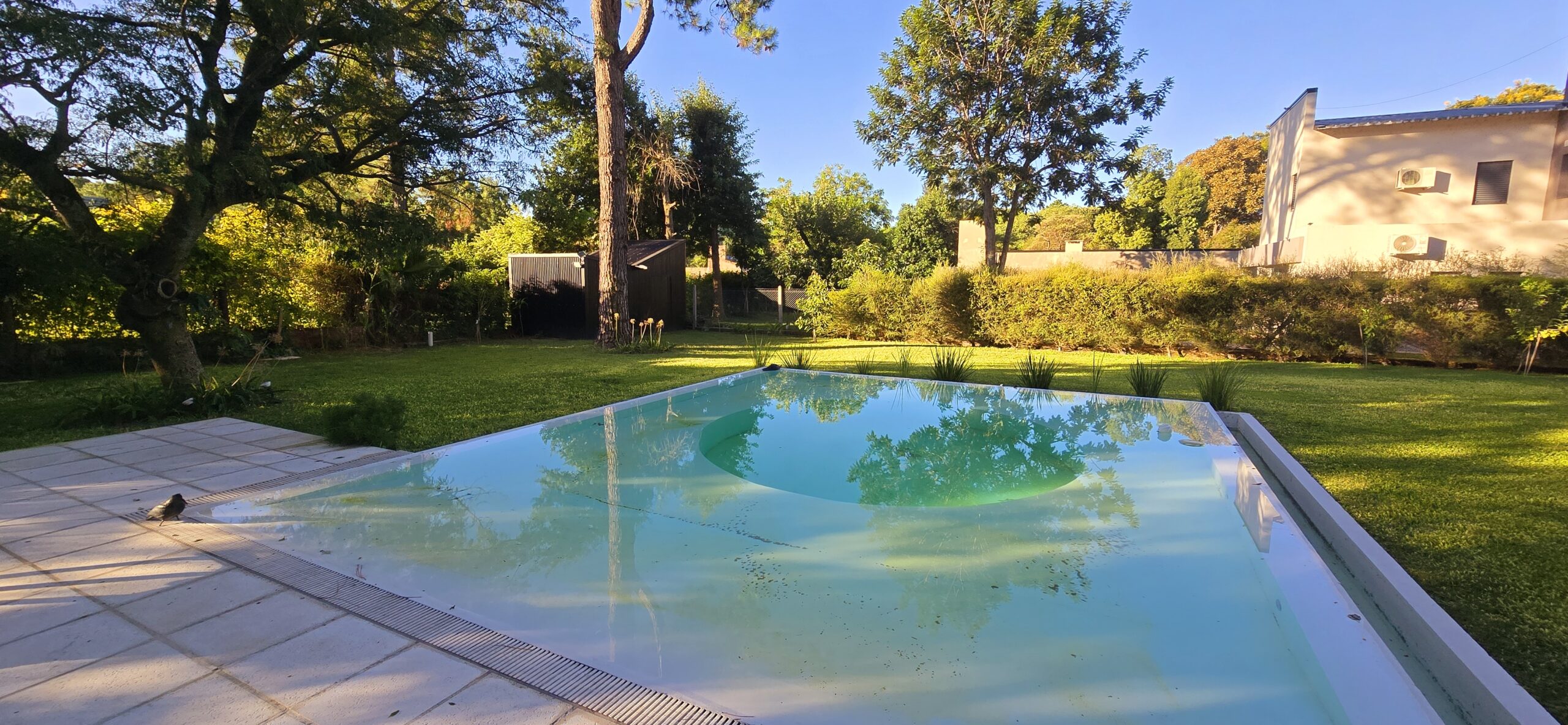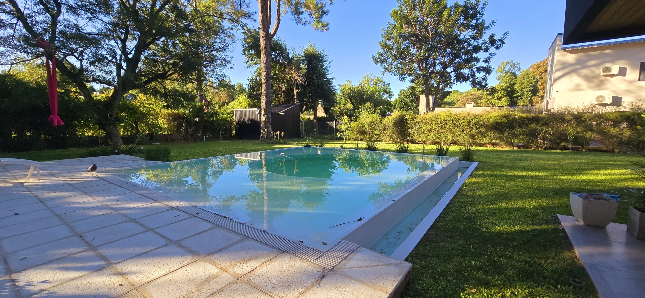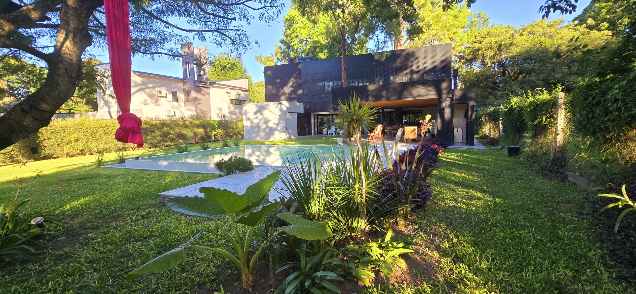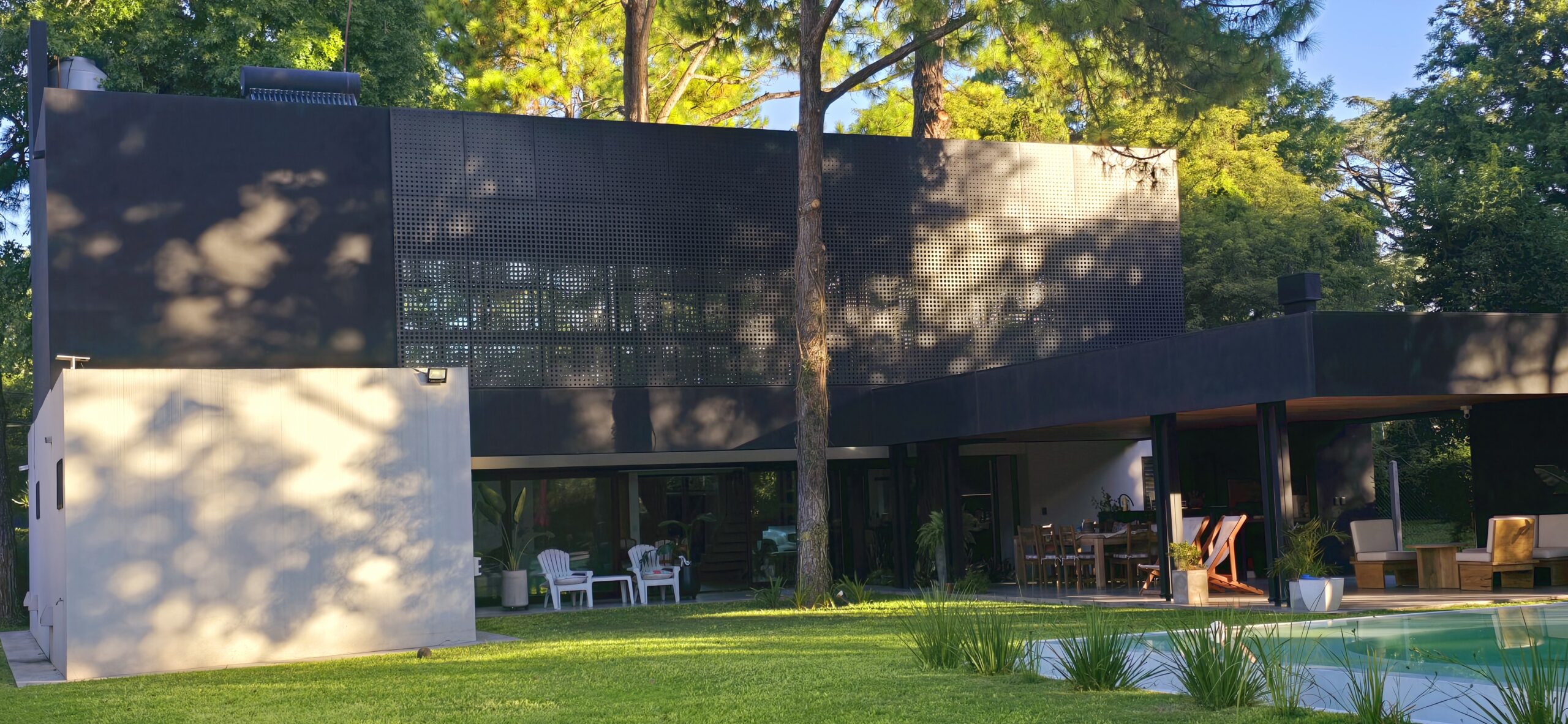 Contempla un programa funcional amplio, en la cual la vida propia de la vivienda se desarrolla en planta baja, con un espacio central en doble altura donde balconea la circulación de planta alta, una habitación principal en suite despegada del bloque principal buscando la mayor privacidad de la vida social de la vivienda. Un baño principal con una sala de usos múltiples que se abre hacia el patio y la galería también en doble altura protegida por un parasol metálico con un cantero central en donde crecerá la vegetación que actúa de sistema de optimización solar, dejar ingresar en invierno y evitarlo en verano. Esta galería envuelve a un pino añoso, por el cual la vivienda se emplaza desde este punto. Desde ahí se desprende el sector de social recreativo, una amplia galería con sus apoyos, asador, depósitos y baño, rematando con una imponente piscina, con una característica distintiva, un solárium húmedo 360°. Esta debe contemplarse como una área social y de funcionamiento predominante. Con un solárium húmedo y seco, y por supuesto buscando captar sensorialmente a los usuarios, no solo desde lo obvio, refrescarse y recrearse sino también la emoción de estar en un espacio libre, abierto, natural.
